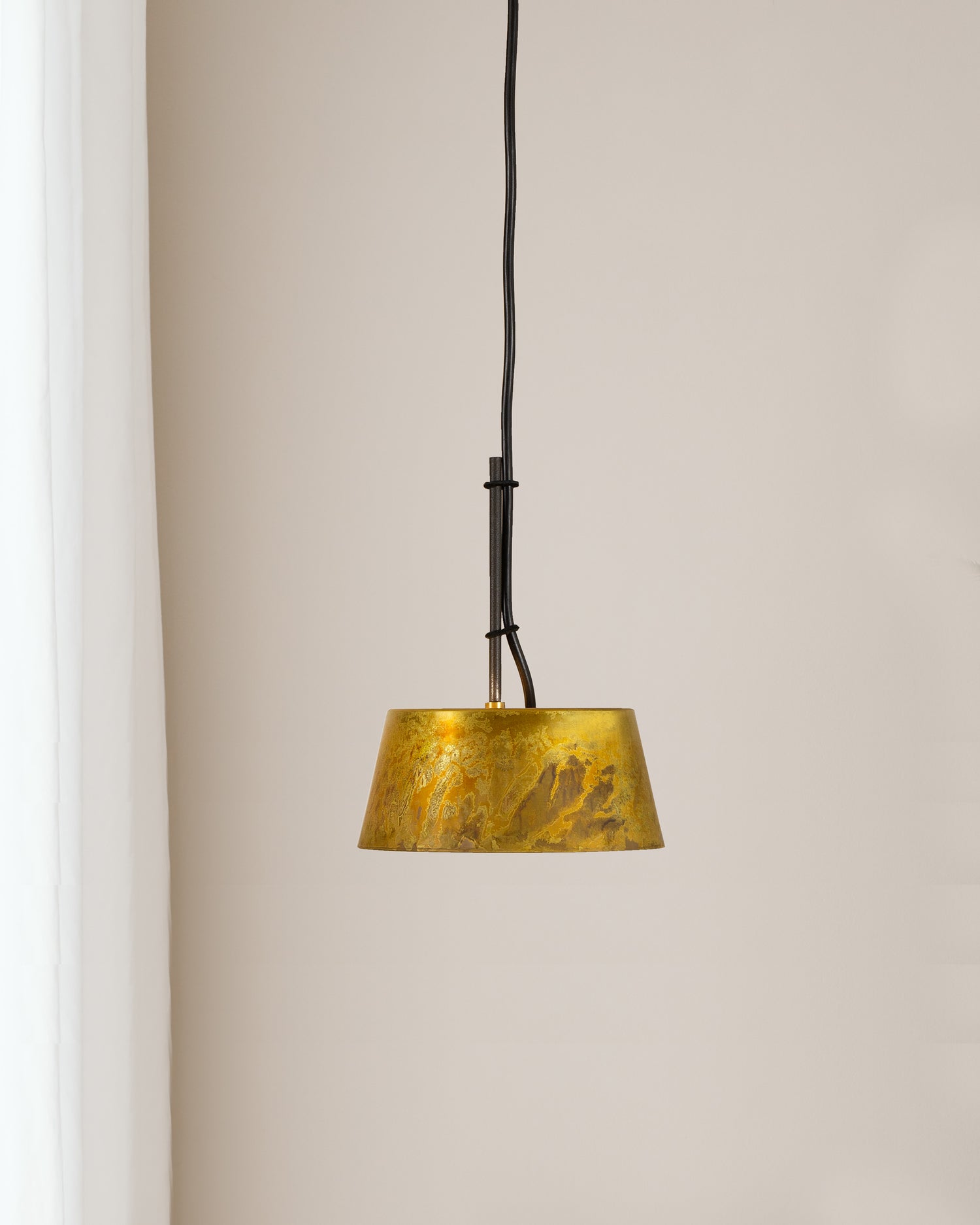 Karl pendel 952-1512 är en liten men uttrycksfull pendel med patinerad rå mässing eller pulverlack i greige eller mörkgrått. Storleken på 15 cm diameter gör den idealisk som fönsterlampa eller i kluster över bord eller bardisk. Varje mässingsskärm patineras för hand, vilket ger lampan ett levande och unikt uttryck.