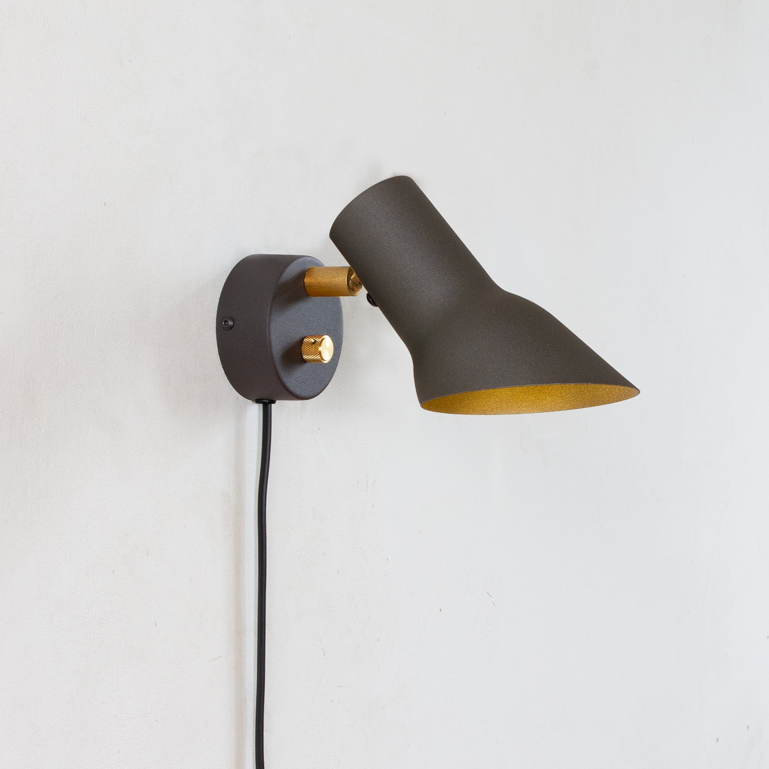 Välj mellan skärm och väggfäste i patinerad rå mässing eller matt mörkgrå pulverlack. I fast installation finns även kulören greige. Vägglampan är riktbar 360° och passar lika bra i hemmet som i offentliga miljöer.