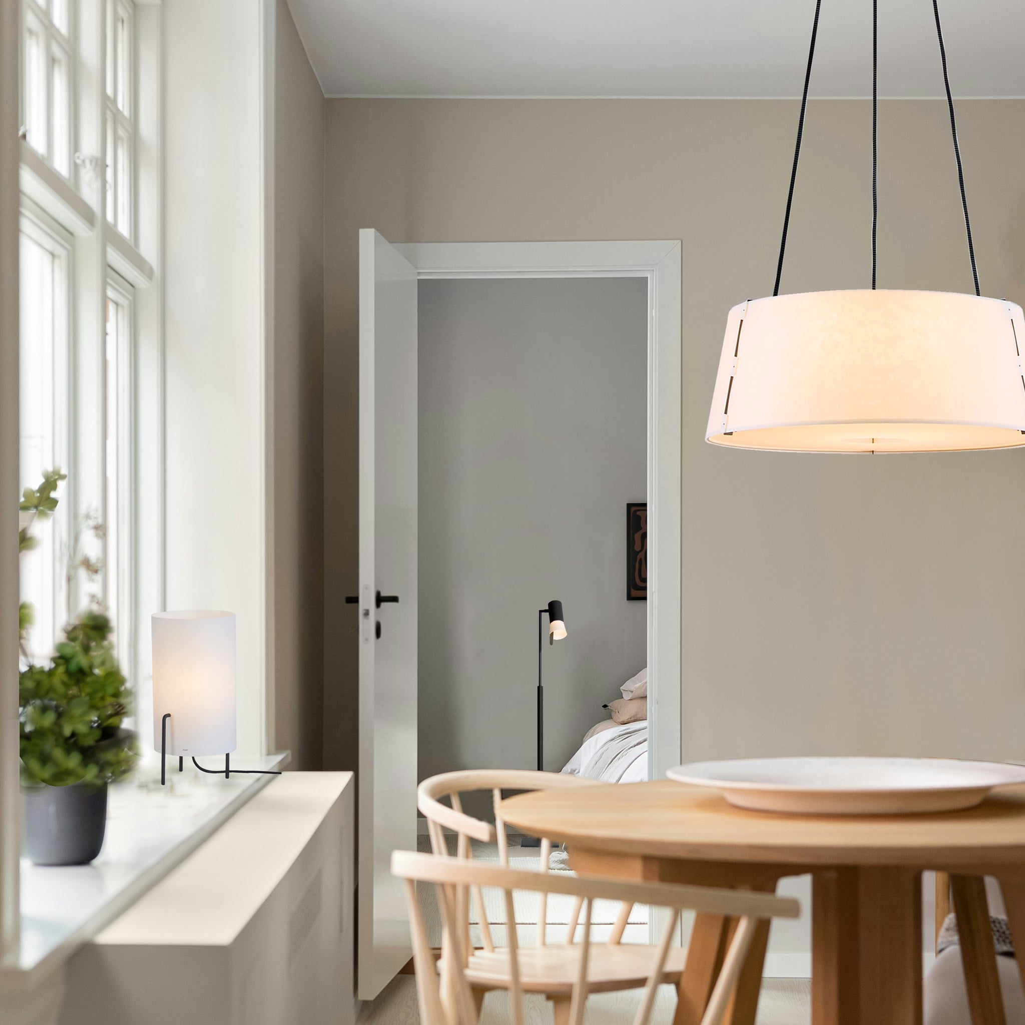 Dans le salon, il est important de combiner un éclairage d'ambiance et un éclairage fonctionnel. Utilisez des lampadaires et des lampes de table pour créer des coins cosy. Une lampe de lecture réglable en hauteur près du fauteuil ou du canapé peut également être combinée avec des plafonniers pour éclairer toute la pièce si nécessaire. Suggestions d'éclairage pour le salon : lampes de table Karl , Zpindel et Trefot sur un buffet ou une fenêtre. Lampe de lecture Q10, lampadaire Erik , lampadaire Q15 . À côté du canapé : lampadaire Zladd , lampadaire Gadd , lampadaire Vega . Applique murale derrière le canapé : applique Zladd.